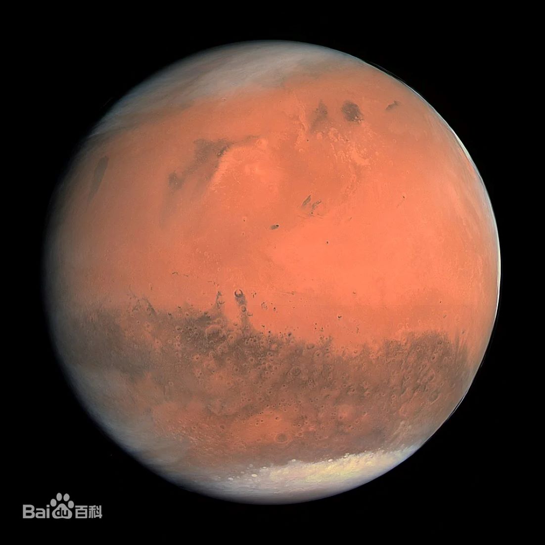 火星(英语:Mars;拉丁语:Martis;天文符号:♂),是距离太阳第四近的行星,也是太阳系中仅次于水星的第二小的行星,为太阳系里四颗类地行星之一。 欧洲古称火星为“马尔斯 [43]”,古罗马神话中的“战神”,也被称为“红色星球”。古汉语中则因为它荧荧如火,位置和亮度时常变动而称之为荧惑。 其橘红色外表是因为地表被赤铁矿(氧化铁)覆盖,火星的直径约为地球的一半,自转轴倾角和自转周期则与地球相近,但公转周期是地球的两倍。火星亮度最高可达-2.9等,但在大部分时间里比木星暗。 [1] 火星大气以二氧化碳为主(95.3%),既稀薄又寒冷,遍布撞击坑、峡谷、沙丘和砾石,没有稳定的液态水。南半球是古老、充满撞击坑的高地,北半球则是较年轻的低地平原。火星上最大的火山—奥林帕斯山和最大的峡谷—水手号峡谷。火星有两个天然卫星:火卫一和火卫二,形状不规则,可能是捕获的小行星。根据观测的证据,在火星观察到类似地下水涌出的现象,南极冰冠有部分退缩,雷达数据显示两极和中纬度地表下存在大量的水冰。 |